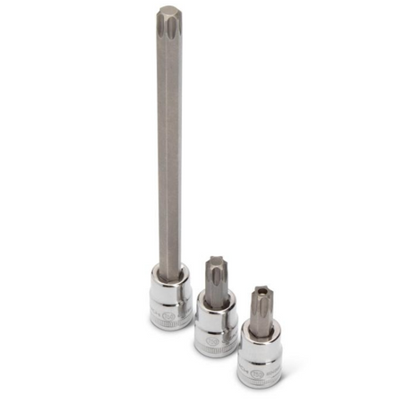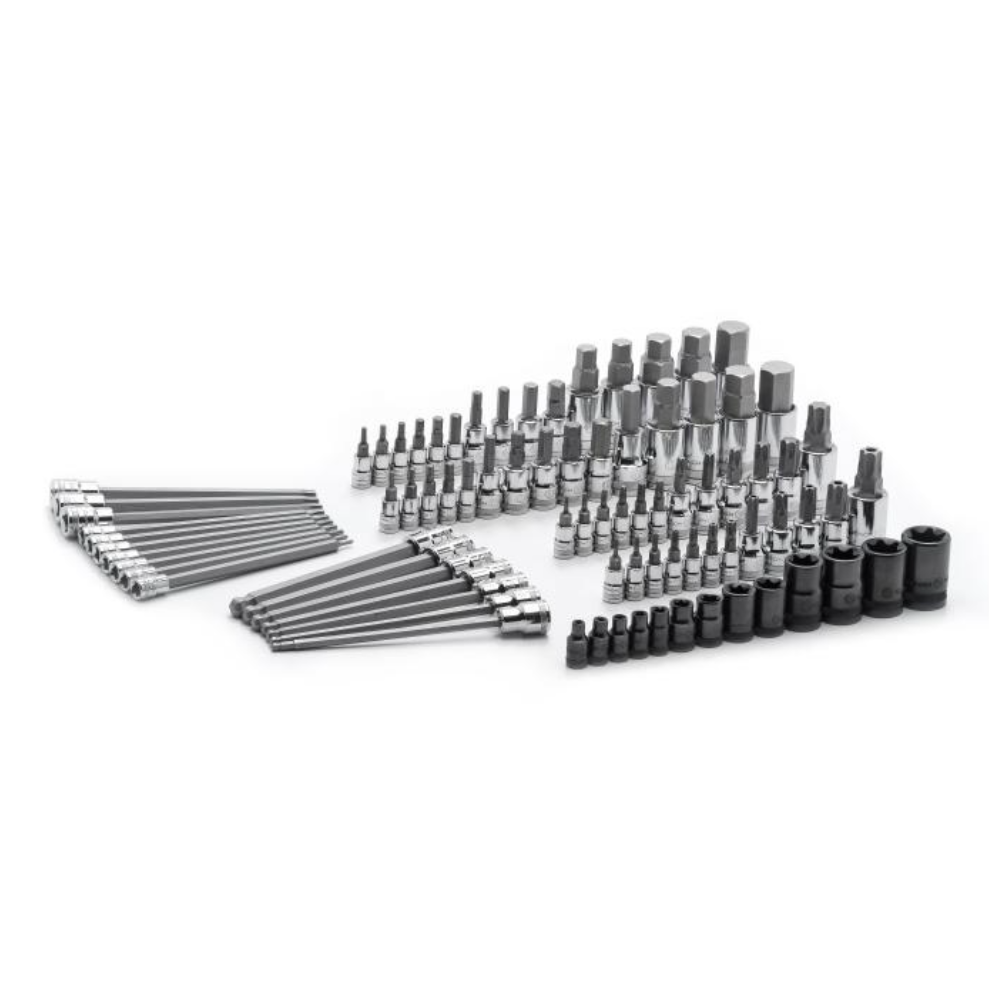 - Set contains hex, ball end hex, torx® bit sockets, external torx® bit sockets, tamper proof torx® bit sockets