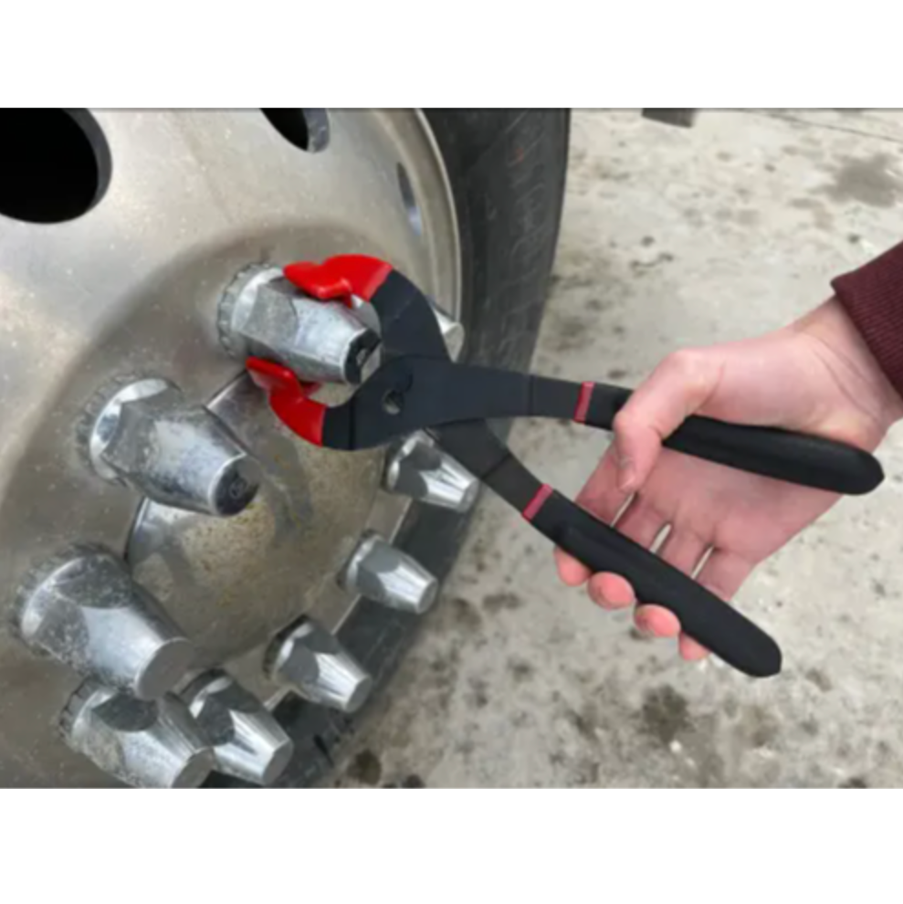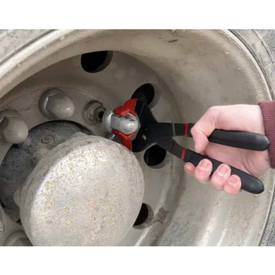 Used when removing chrome lug nut caps found on heavy-duty trucks, trailers and motor homes. Plastic coated jaws prevent tool from slipping off the cap and scratching the chrome finish. Two-position, slip joint handle, allows the tool to work on small and large caps. Double-dipped handles for comfort.