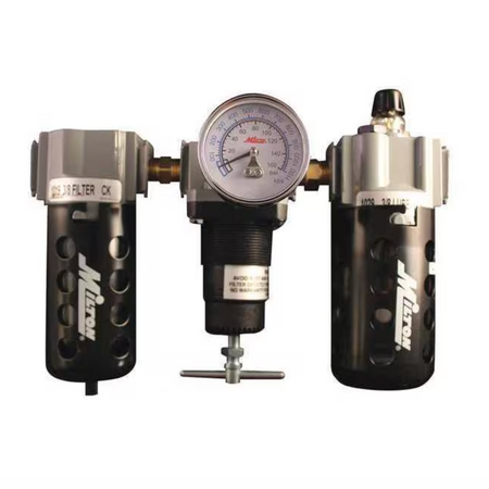 3/8" NPT Deluxe FRL trio is a filter, regulator and lubricator all in one. The filter has an automatic overnight drain, the regulator is the relieving type and the lubricator is drip style. This pre-assembled unit has polycarbonate bowls with metal bowl guards and includes a gage. Offers a maximum of 150 PSI and 75 SCFM. 40 micron filter element.