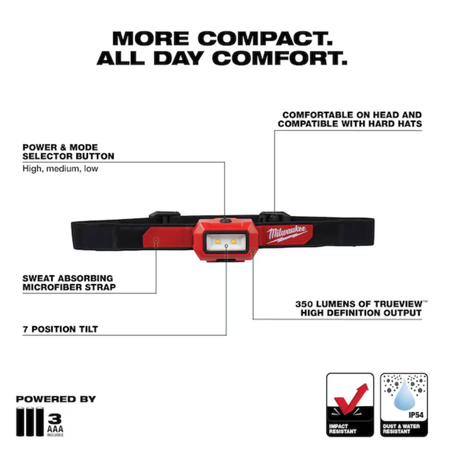 Our Headlamp is more compact for all day comfort and delivers you 350 lumens of TRUEVIEW™ High Definition output in a wide flood beam. The Milwaukee LED headlamp is optimized to be lightweight and compact with a strap made from a washable, sweat absorbing micro-fiber, giving you all-day comfort when worn on the forehead. The headlamp light's impact-resistant housing is built to withstand the toughest conditions. It survives drops and is IP54 rated for water and dust resistance. You can direct light by pivoting the light head using one of the 7 different tilt positions. Our headlamp has 3 light output modes to manage brightness and runtime, giving you up to 28 hours of runtime. The MILWAUKEE® headlamp includes four clips for secure attachment to hard hats while you are on the jobsite. Our headlamp is covered by our Limited Lifetime Warranty.(1) USB Rechargeable Low-Profile Headlamp (2115-21)