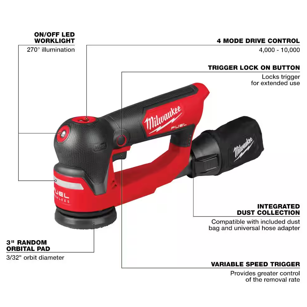 Designed for the professional carpenter, remodeler, or general contractor; the MILWAUKEE M12 FUEL 3" Random Orbital Detail Sander combines the power and efficiency to sand the toughest materials on site while the compact pad size allows for delicate, controlled sanding during the installation of trim, railings or other refinishing applications.