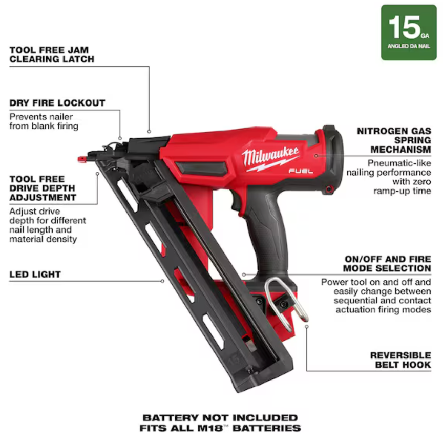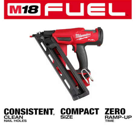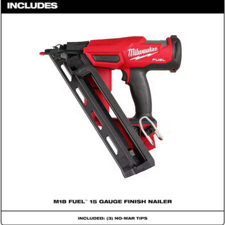 Our M18 FUEL™ 15 Gauge Finish Nailer provides peak productivity at your jobsite, delivering unmatched nailing performance without the hassle of a compressor and hose. Leveraging our nitrogen air spring mechanism, the 15 Gauge Finish Nailer allows you to consistently sink nails to your required depth in hard and soft woods while leaving clean nail holes, making for repeatable results and easy filling. The nitrogen air spring mechanism, combined with our POWERSTATE™ Brushless Motor and REDLINK PLUS™ Intelligence, delivers a pneumatic-like nailing response with zero ramp-up time from nail to nail, keeping you productive and efficient throughout your job. This cordless finish nailer features a compact and ergonomic design providing access into tight spaces where nailing is required while limiting fatigue when using the tool. When paired with an M18™ REDLITHIUM™ CP2.0 battery pack, this battery-powered nailer fires up to 750 nails per charge and is fully compatible with all M18™ REDLITHIUM batteries. The MILWAUKEE® M18 FUEL™ 15 Gauge Finish Nailer delivers the pneumatic performance that professional carpenters and remodelers demand, with the freedom and convenience of cordless.