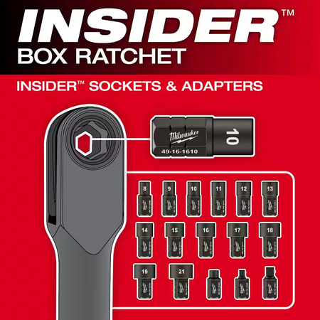 The M12 FUEL™ INSIDER™ Extended Reach Box Ratchet is a new-to-world solution that reinvents the traditional ratchet. The low-profile head design allows sockets & adapters to be inserted directly into the tool. Our M12 FUEL™ INSIDER™ delivers UNRIVALED ACCESS and over ¾” shorter head profile size with the socket to reach deep into the engine bay and fit into the tightest spaces. The INSIDER™ delivers the combination of 60 FT-LBS OF MAX TORQUE and 350 RPMs to remove stubborn fasteners and complete more work faster. Mechanics will experience the ULTIMATE VERSATILITY with our provided INSIDER™ Box Ratchet Sockets (8-19, & 21mm), ¼” Hex Bit, ¼” anvil adapter, & 3/8” anvil adapter to tackle any job in the shop. Our Box Ratchet 6 Point Sockets are pass through up to 15mm & 9/16” to run nuts on threaded rod and eliminate the frustration of sockets bottoming out. Our M12 FUEL™ INSIDER™ Extended Reach Box Ratchet is part of the M12™ System, which is fully compatible with over 150 solutions.