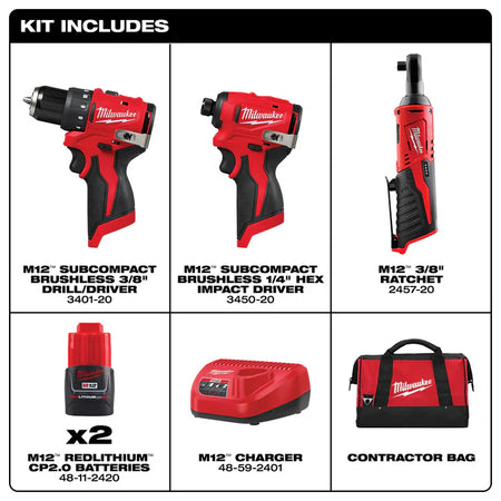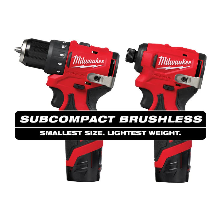 Our M12 Subcompact Brushless 2-Tool Combo + Ratchet Kit features the most compact and lightest weight drill and impact driver, providing ultimate access into tight spaces. The compact drill is only 5.4" long and under 2 pounds with a battery, allowing for minimal fatigue and excellent control, especially while working in tight spaces. The brushless motor delivers optimal tool performance at 350 in-lbs. of torque and up to 1,550 RPM. The impact driver measures only 4.3" in length and 2.0" in width, allowing for best access in tight spaces and weighing only 1.7 pounds with a battery. The brushless motor technology provides faster driving speeds with 1,100 in-lbs. of torque and up to 3,000 RPM to increase productivity. The ratchet produces up to 35 ft-lbs of torque and 2,500 RPM, giving users thw power and speed of a pneumatic ratchet without the hose. At just 10-3/4" long and 1.9lbs, the ratchet is tool-blet portable, and features a 3/4" low profile head for work in the tightest of spaces and engine bays. MILWAUKEE REDLINK Intelligence communicates with the M12 REDLITHIUM batteries to provide optimal performance for the tools. The M12 Subcompact Brushless 2-Tool Combo Kit is part of the M12 system, fully compatible with over 150+ solutions.