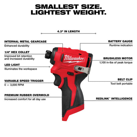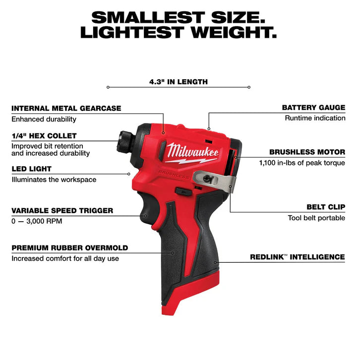 - (1) M12 Subcompact Brushless 1/4" Hex Impact Driver (3450-20)