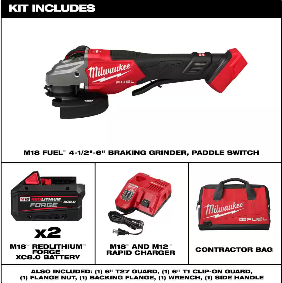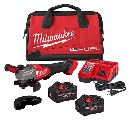 Our M18 FUEL™ 4-1/2" / 6" Braking Grinder Paddle Switch battery kit is the next advancement in power and performance, generating 13A corded power, fastest cutting, and delivering up to 135 cuts per charge. The M18 FUEL™ 4-1/2" / 6" Braking Grinder Paddle Switch battery kit generates 13A corded power allowing you to complete the toughest grinding and cutting applications, all on the M18™ Cordless System. The POWERSTATE™ Brushless Motor delivers maximum sustained power and 9,000 RPM to remove material faster and increase productivity. REDLINK PLUS™ Intelligence ensures unmatched levels of performance, protection, and compatibility. The RAPIDSTOP™ Brake provides stop times under 2 seconds with an abrasive disc. The M18 FUEL™ 4-1/2" / 6" Braking Grinder Paddle Switch battery kit includes an electronic clutch for kickback protection, as well as overload protection to maximize motor life. The M18™ REDLITHIUM™ FORGE™ XC8.0 Battery Pack for HIGH OUTPUT™ HD12.0 power in a smaller size, and longest life vs. REDLITHIUM™ batteries. The MILWAUKEE® M18 FUEL™ 4-1/2" / 6" Braking Grinder Paddle Switch battery kit includes two M18™ REDLITHIUM™ FORGE™ XC8.0 Battery Packs and one M18™ & M12™ Rapid Charger.