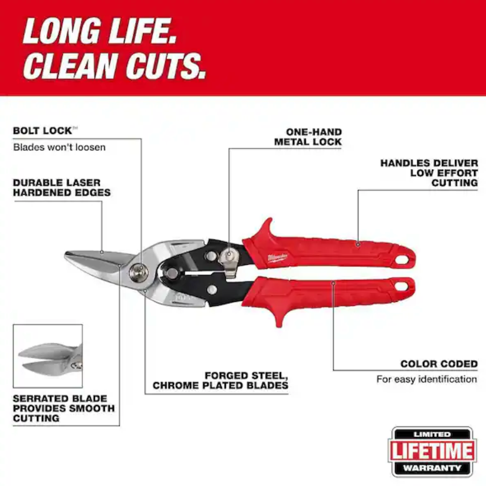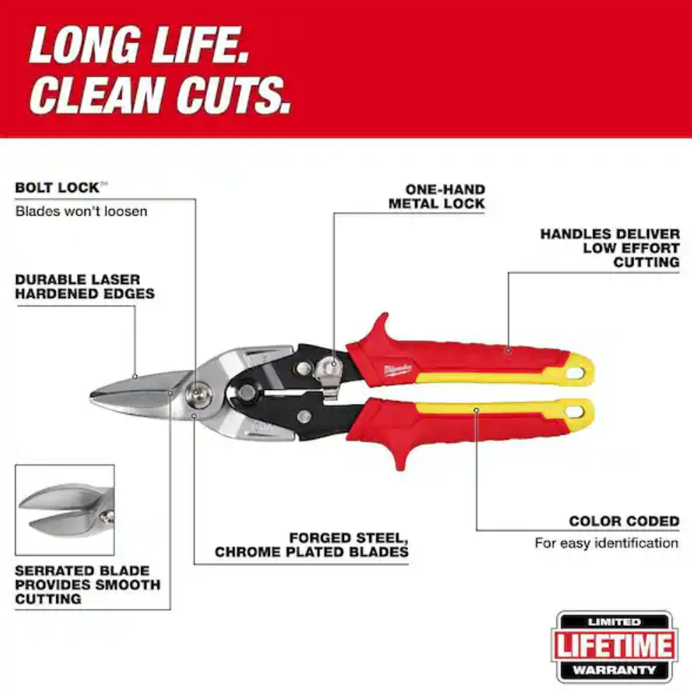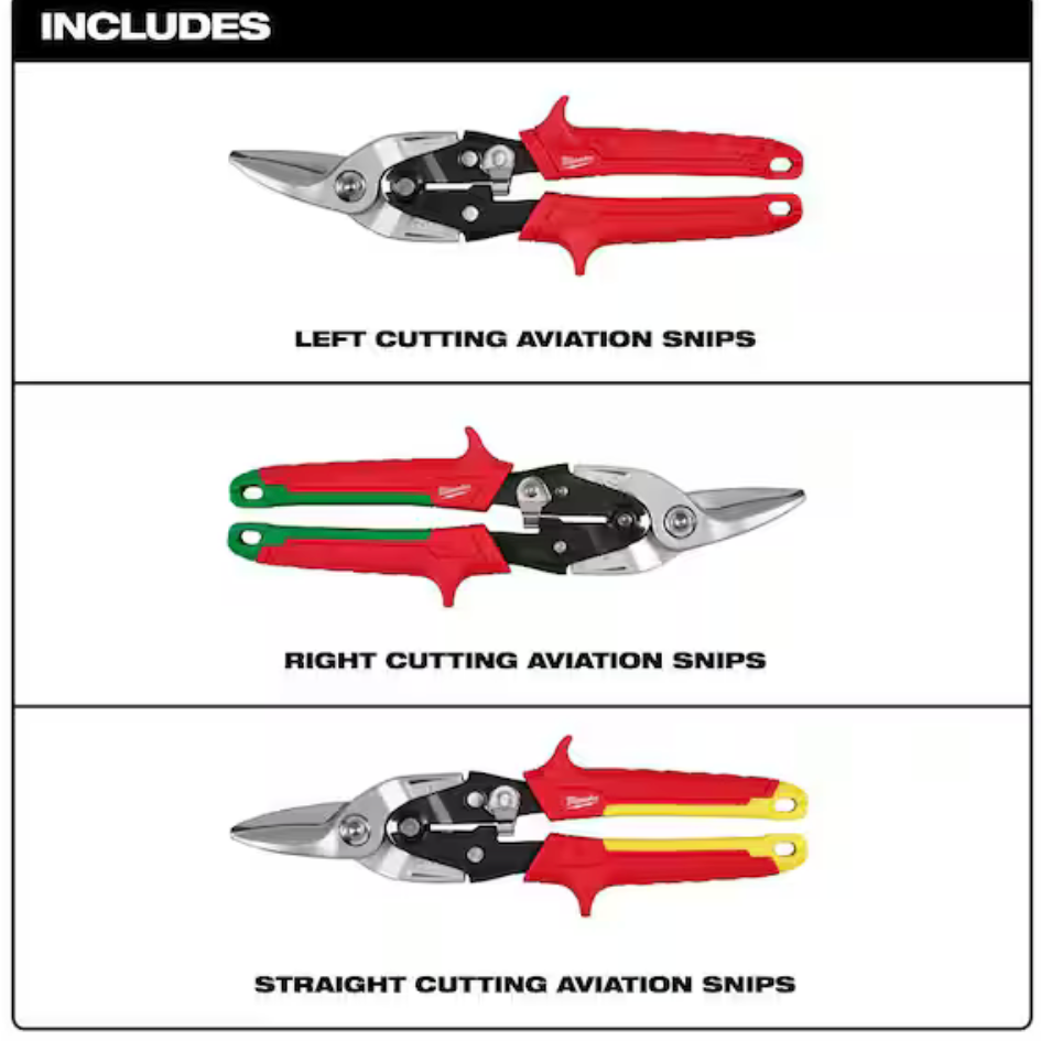 The MILWAUKEE 3PC Aviation Snip Set is built for long life and clean cuts. Forged blades with laser-hardened edges are durable and deliver long life.