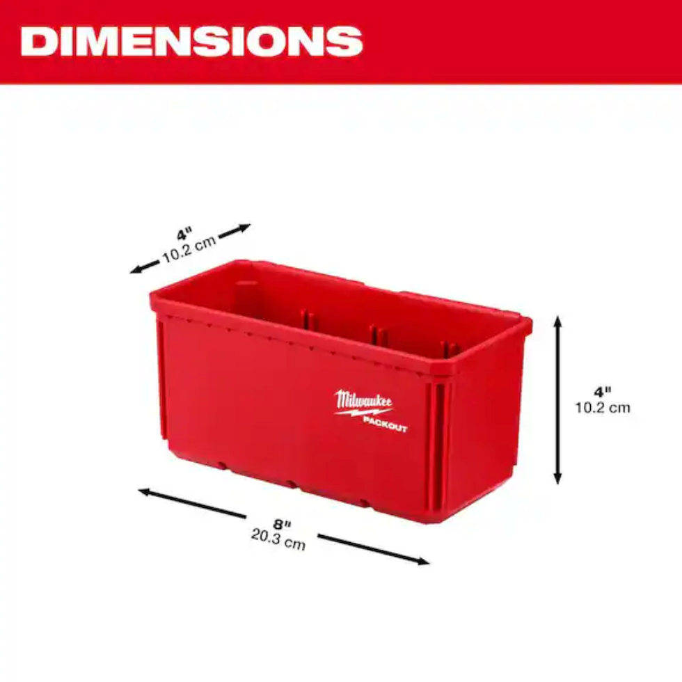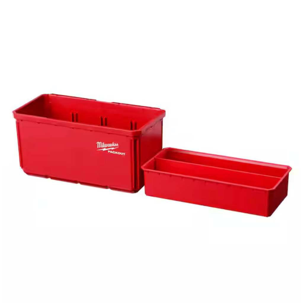 Our 2pk Large Bin Set for PACKOUT™ can be stored inside MILWAUKEE® PACKOUT™ Organizers and Compact Organizers (48-22-8430 & 48-22-8435) and hung on Mounting Plates. Constructed with an impact resistant body, these bins are built to withstand harsh jobsite conditions. Each large bin features a removable interior organization tray to organize jobsite supplies. These large storage bins can be used to organize and store small items like fittings, fasteners, bits, and more. Our Large Bin Set includes (2) Bins, (2) Interior Organization Trays, and (6) Removable Dividers. MILWAUKEE® PACKOUT™ is the industry's most versatile and durable modular storage system.