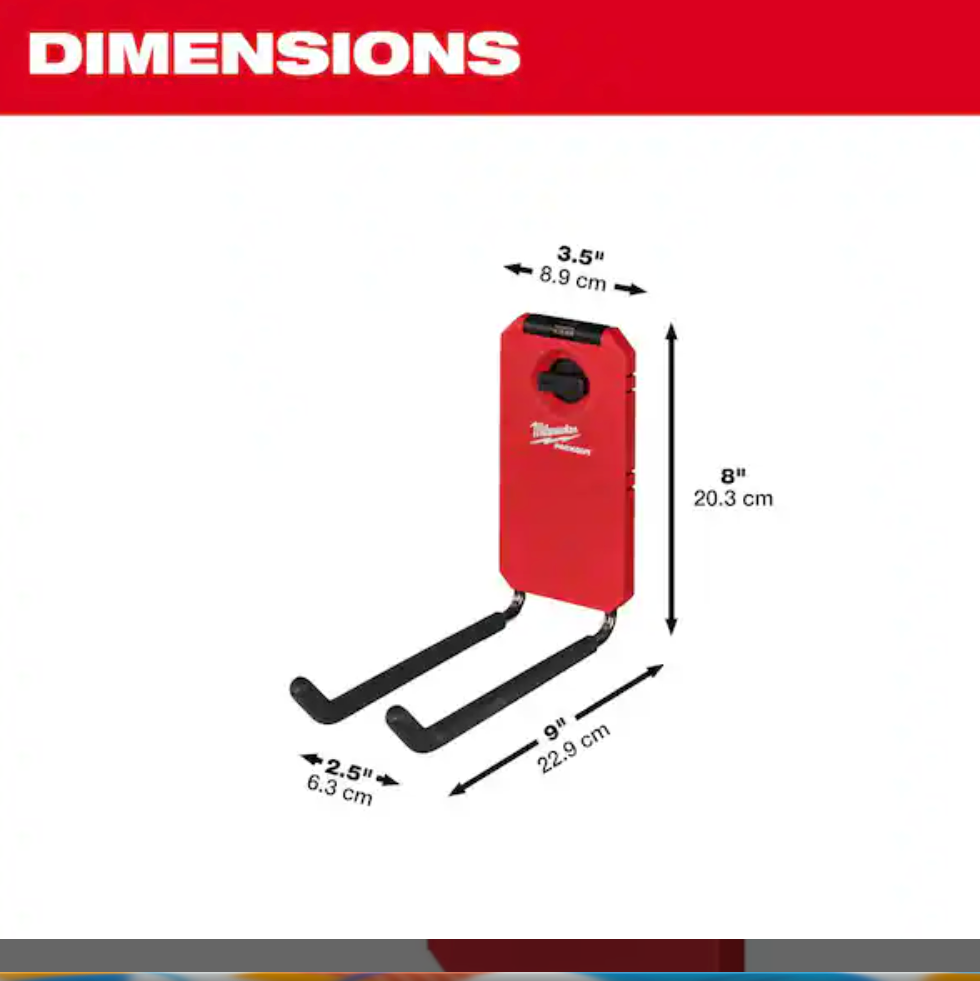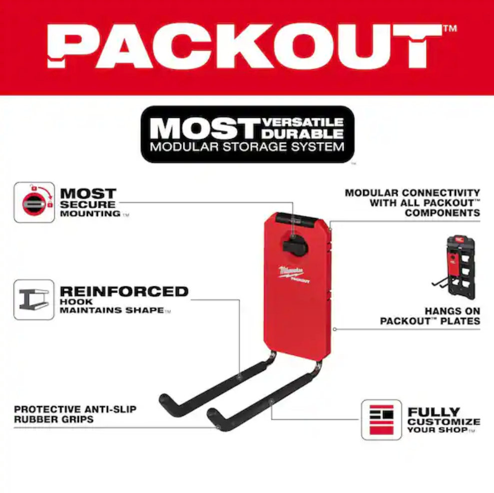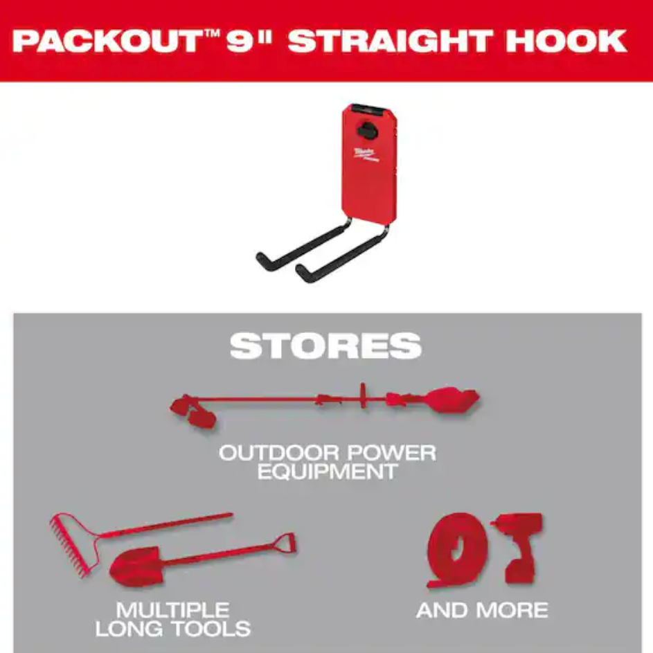 The PACKOUT 9" Straight Hook features an innovative locking mechanism that provides the most secure mounting in the shop and garage.