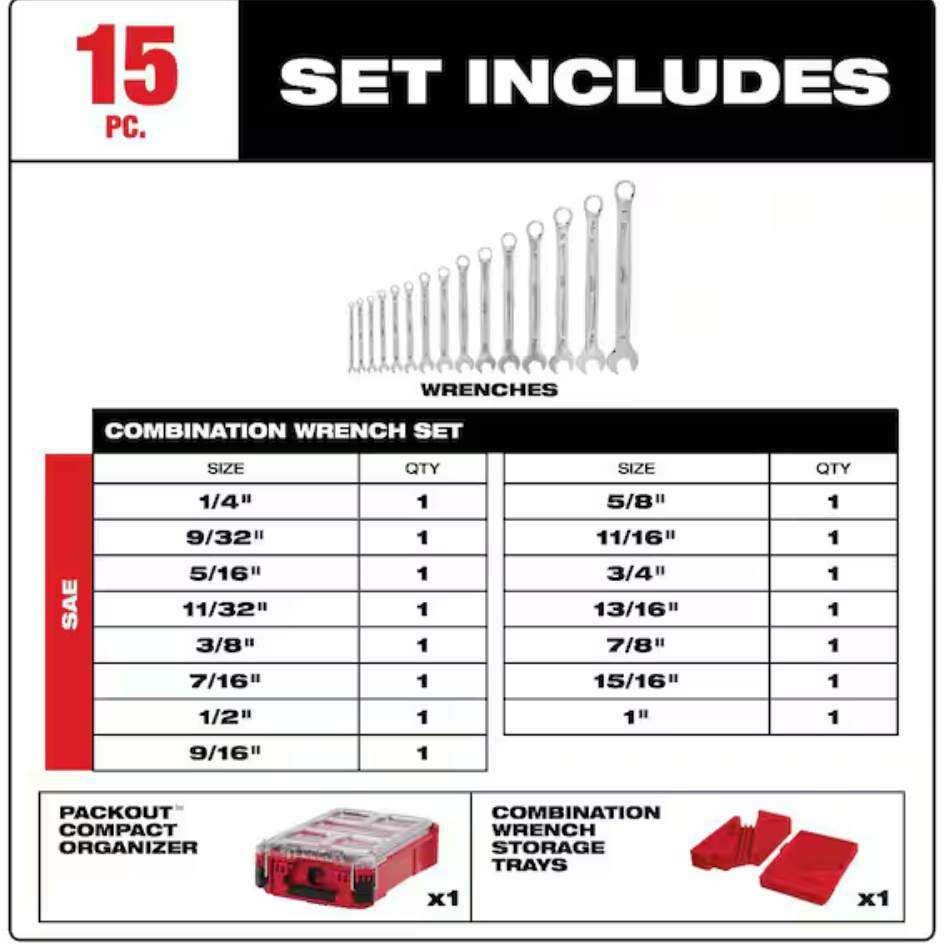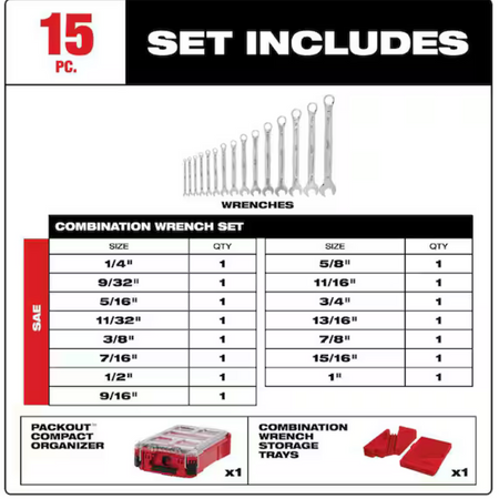 Milwaukee 48-22-9484 - 15pc SAE Combination Wrench Set with PACKOUT™ Compact Organizer