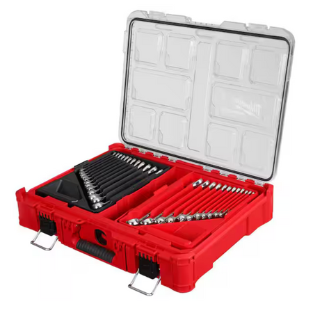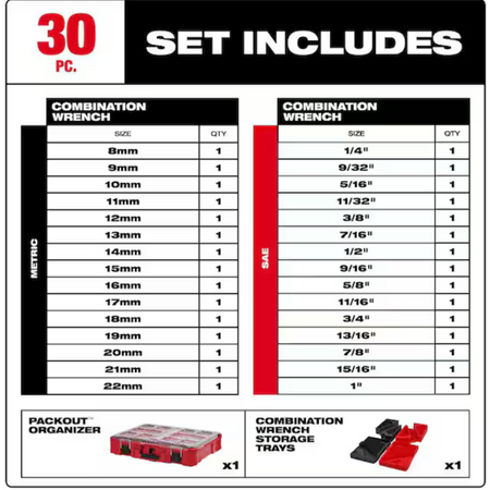The Milwaukee 30PC Metric & SAE Combination Wrench Set with PACKOUT Organizer includes combo wrenches that deliver up to 25% more torque. The MAX BITE Open-End Grip improves the wrench's grip on nuts and bolts, and the geometry reduces rounding and stripping. The I-Beam handle design provides comfort in high torque applications and features easy-to-read ink-filled size labeling. All Milwaukee Mechanics Hand Tools are backed by a Lifetime Guarantee. The included PACKOUT Organizer is part of the Most Versatile Durable Modular Storage System. The Organizer is IP65-rated and built from impact-resistant materials for durability on and off the jobsite. All PACKOUT is backed by a Limited Lifetime Warranty.
