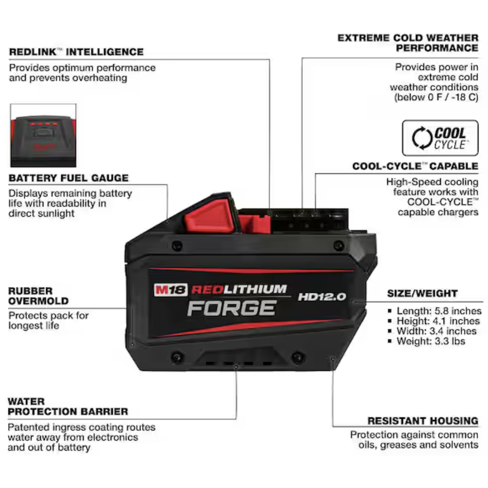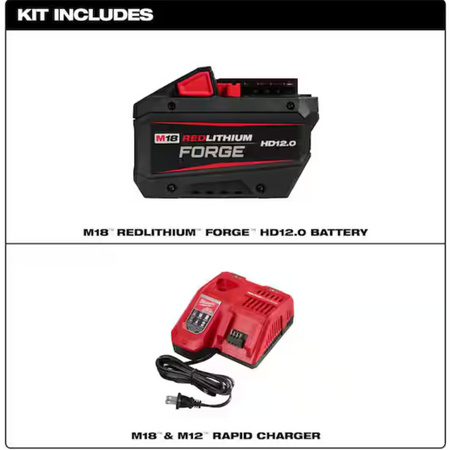 The MILWAUKEE M18 REDLITHIUM FORGE HD12.0 Battery Pack delivers 50% more power vs the HIGH OUTPUT 12.0, and the longest life vs REDLITHIUM batteries. REDLITHIUM FORGE are Milwaukee's most powerful, fastest charging, and longest life batteries. The M18 REDLITHIUM FORGE HD12.0 delivers 12 amp hours of runtime with 50% more power vs the HIGH OUTPUT 12.0, providing optimal power and runtime for demanding applications. This lithium-ion battery has the longest life, the most recharges, and the best performance over the life of the battery. It is also designed with resistant housing for increased protection against exposure to common oils, greases, and solvents. Built-in REDLINK Intelligence protects the battery from overloads, preventing you from damaging your cordless power tools in heavy-duty situations. The REDLITHIUM FORGE HD12.0 battery is fully compatible with 275+ M18 solutions. Our M18 & M12 Rapid Charger charges battery packs up to 40% faster, reducing your downtime and maximizing your productivity. The battery charger accepts all MILWAUKEE M18 and M12 batteries, providing a charging upgrade for both systems. The battery charger communicates directly with your battery pack to monitor cell voltage, temperature, and charge status to ensure a full charge.