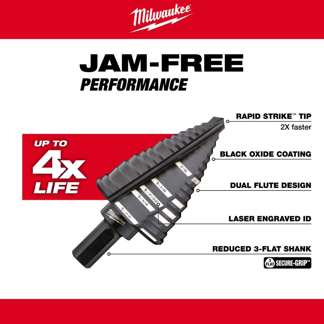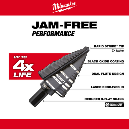 Milwaukee® step drill bits with jam-free performance feature a dual flute design delivering up to 2X faster hole cutting, up to 4X longer life and up to 50% more holes per battery charge. Ideal for drilling large- and small-diameter holes in steel and plastic. Made in U.S.A.