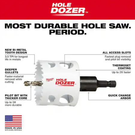 Our 16-Piece HOLE DOZER™ Plumber Hole Saw Kit features a new 3.5 TPI tooth design that offers you the longest life in metal applications. These MILWAUKEE® HOLE DOZER™ Bi-Metal Hole Saws feature the industry's only Lifetime Tooth Break Warranty and can take on all general purpose applications, making them the most durable hole saws. Our HOLE DOZER™ Bi-Metal hole saws are proudly made in the USA.