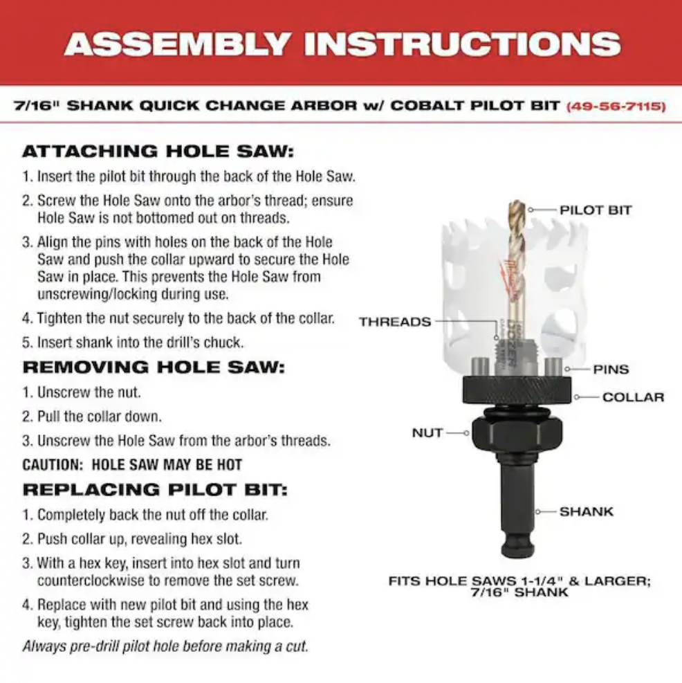 Includes: (1) 1-1/2 in. hole dozer bi-metal hole saw (49-56-9617), (1) 1-3/4 in. hole dozer bi-metal hole saw (49-56-9621), (1) 2-1/4 in. hole dozer bi-metal hole saw (49-56-9628), (1) 2-5/8 in. hole dozer bi-metal hole saw (49-56-9633), (1) 3 in. hole dozer bi-metal hole saw (49-56-9637), (1) 3-5/8 in. hole dozer bi-metal hole saw (49-56-9642), (1) 4 in. hole dozer bi-metal hole saw (49-56-9645), (1) 4-1/4 in. hole dozer bi-metal hole saw (49-56-9647), (1) 4-5/8 in. hole dozer bi-metal hole saw (49-56-0239), (1) small thread arbor (49-56-7010), (1) large thread arbor (49-56-9100), (4) pilot bit (49-56-8010), (1) hex key