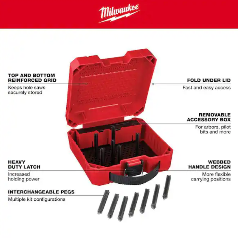 - Reinforced grids on top and bottom keep hole saws securely stored