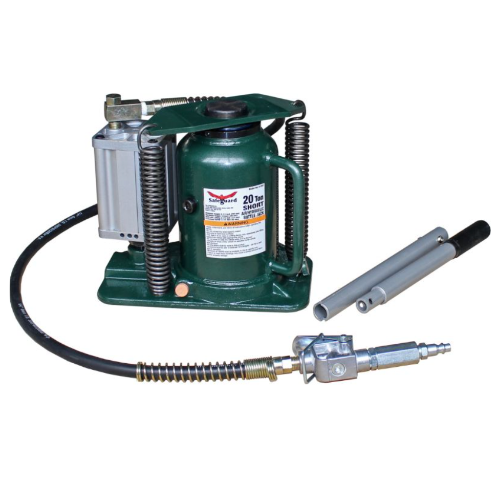 Safeguard 20-Ton Air/Hydraulic, Shorty Bottle Jack has a leakproof, casted design for strength and durability. The high speed turbo motor provides efficient, effortless operation. A built-in bypass device protects the hydraulic system from over-pumping damage. The reduced height styling provides easier positioning under lower vehicles. Can be operated manually when an air source is not available. 10 1/4″ to 20″ lift height. Meets ASME/PASE 2014 Standards.